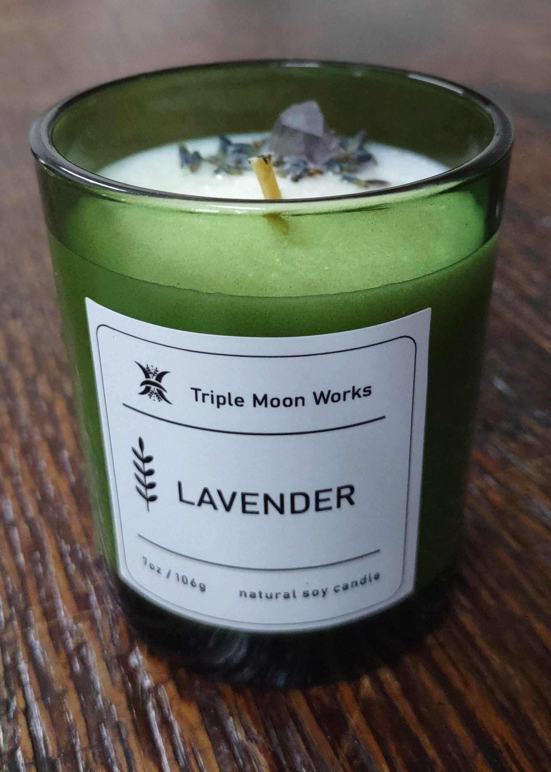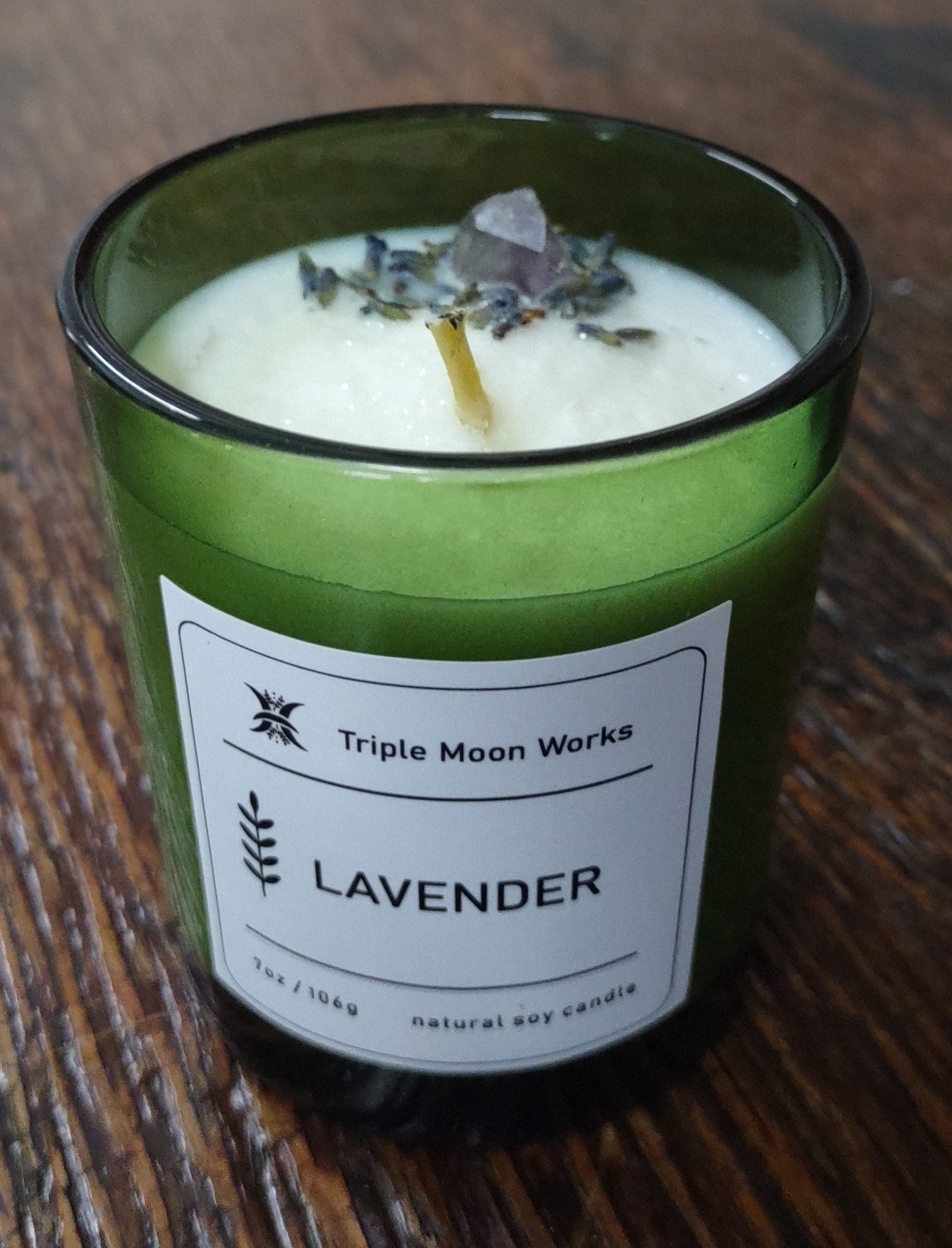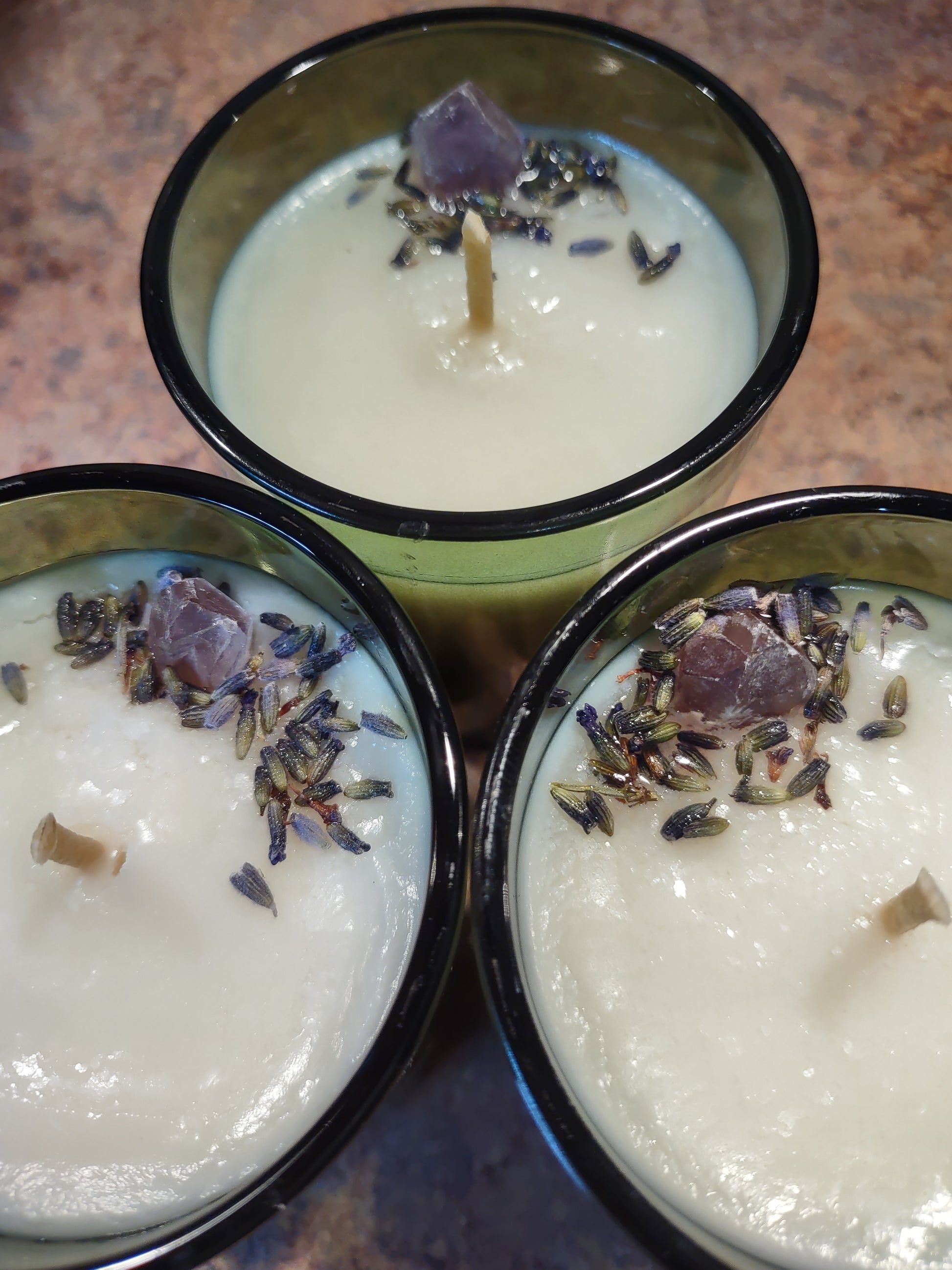 Indulge in the soothing scent of Lavender and the healing energy of Amethyst with our Lavender Amethyst candle. The 7oz candle is paired with a genuine Amethyst point, allowing you to relax and recharge while enjoying the calming aroma. Perfect for self-care or as a unique gift.